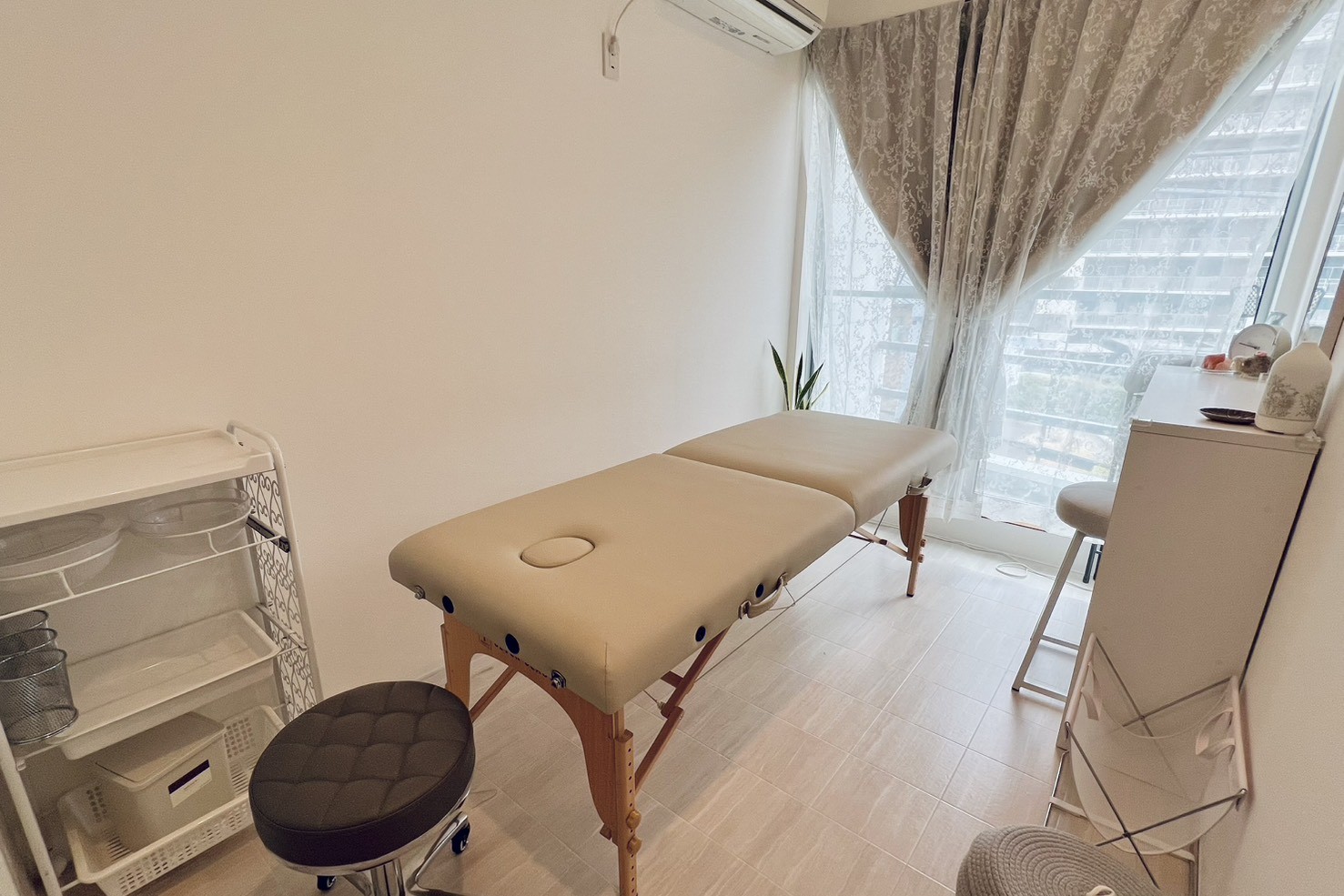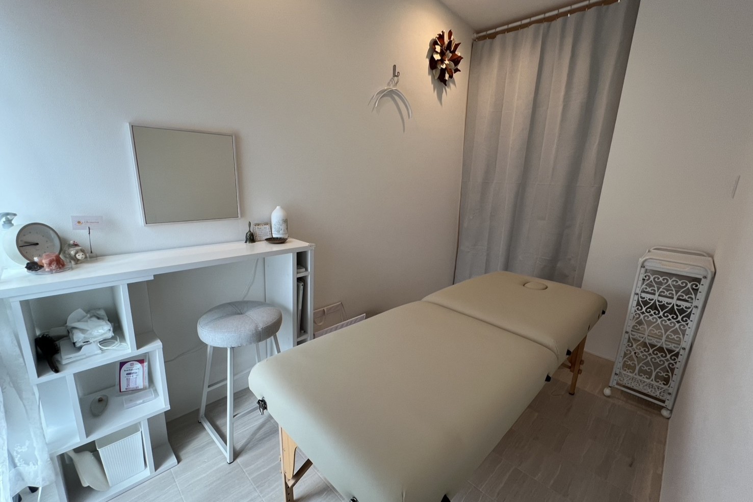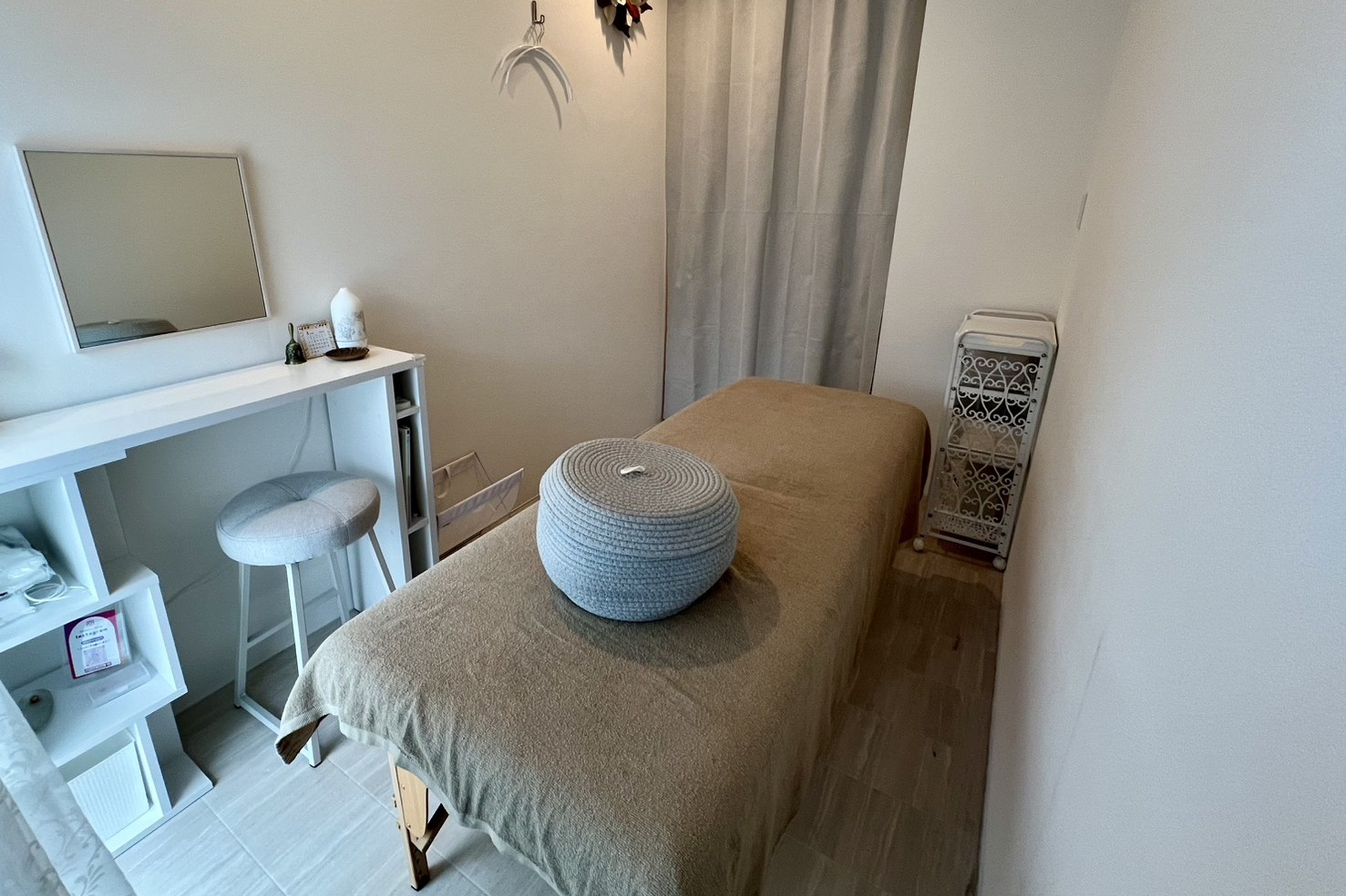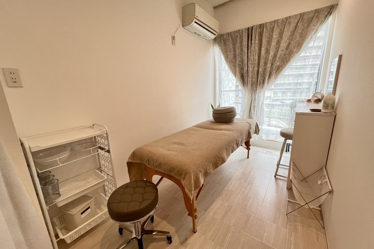 | 主なアイテム | サロンベッド(高さ調整)/スツール/テーブル/ ワゴン/フットバス/タオルウォーマー/ ヒートマット/使い捨てシート/ バストマット/フェイスクッション/冷蔵庫/ エアコン完備/Wifi完備/お手洗い有 |